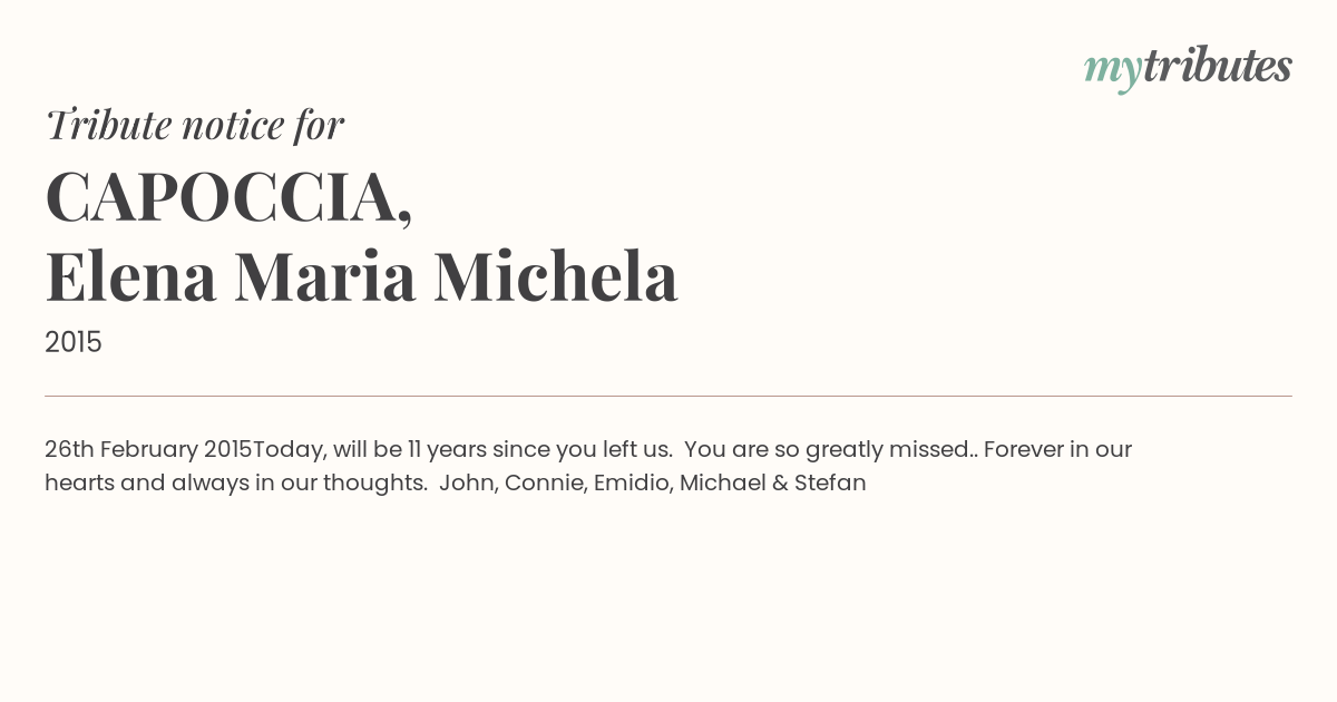 Forever in our hearts and always in our thoughts. John, Connie, Emidio, Michael & Stefan