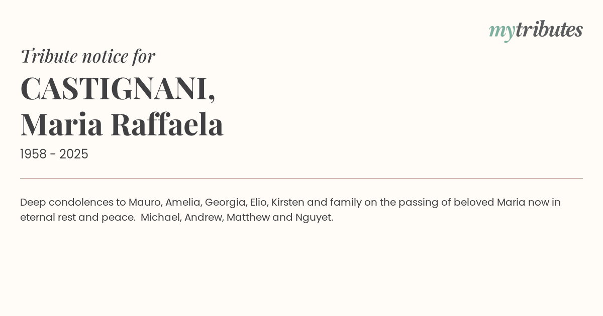 19°CDeep condolences to Mauro, Amelia, Georgia, Elio, Kirsten and family on the passing of beloved Maria now in eternal rest and peace. Michael, Andrew, Matthew and Nguyet.