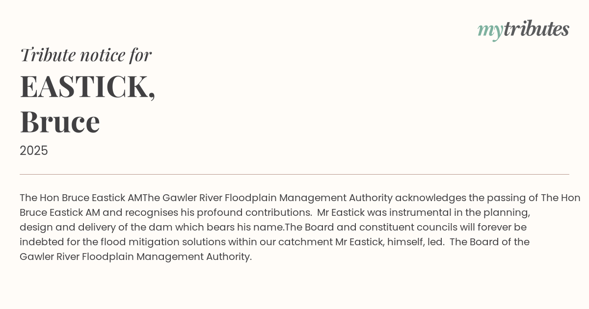 The Gawler River Floodplain Management Authority acknowledges the passing of The Hon Bruce Eastick AM and recognises his profound contributions.