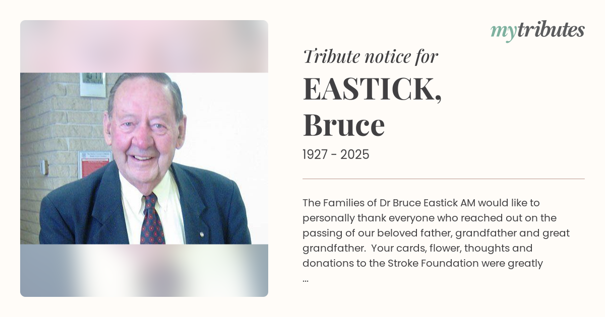 19°CThe Families of Dr Bruce Eastick AM would like to personally thank everyone who reached out on the passing of our beloved father, grandfather and great grandfather. Your cards, flower, thoughts and donations to the Stroke Foundation were greatly appreciated.