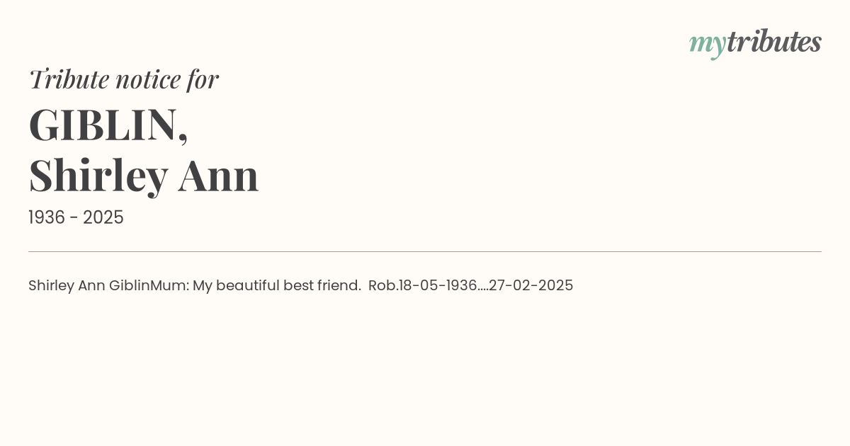 Shirley Ann GiblinMum: My beautiful best friend. Rob.18-05-1936....27-02-2025