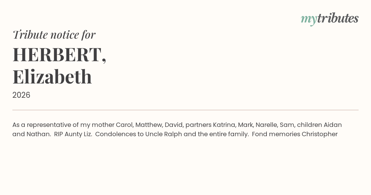 19°CAs a representative of my mother Carol, Matthew, David, partners Katrina, Mark, Narelle, Sam, children Aidan and Nathan. RIP Aunty Liz. Condolences to Uncle Ralph and the entire family. Fond memories Christopher