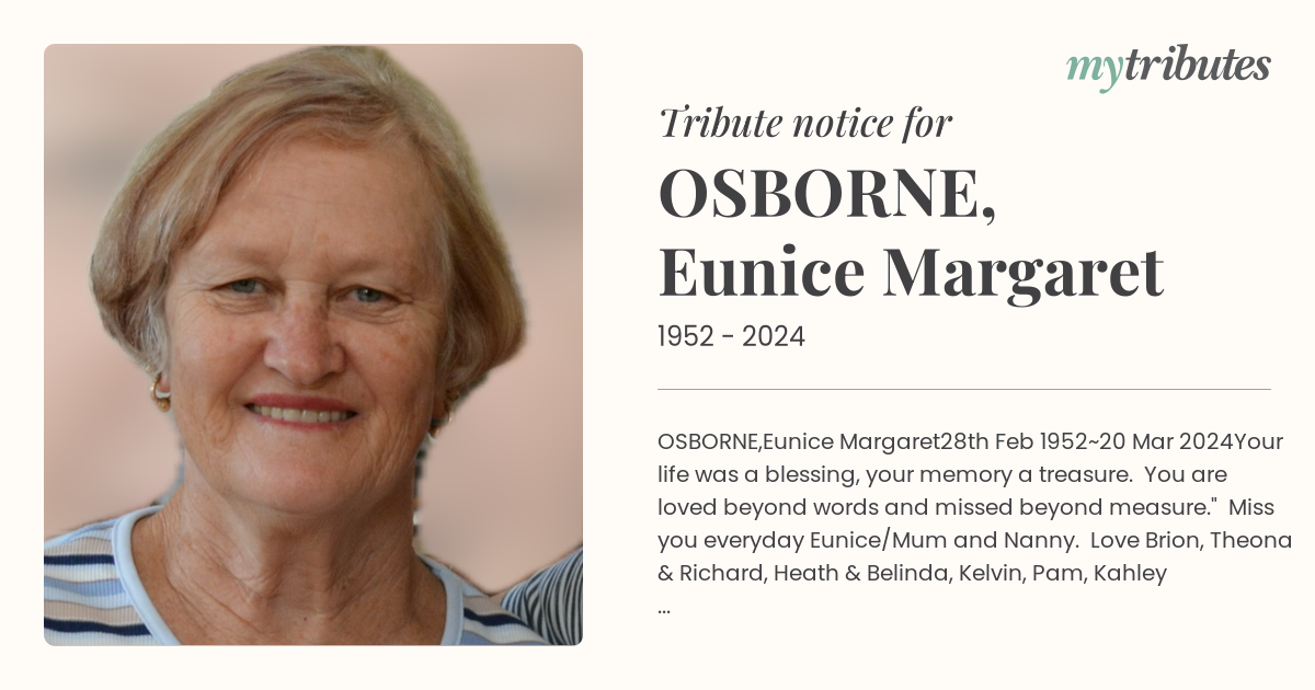 Your life was a blessing, your memory a treasure. You are loved beyond words and missed beyond measure." Miss you everyday Eunice/Mum and Nanny. Love Brion, Theona & Richard, Heath & Belinda, Kelvin, Pam, Kahley & Jesse, Kieren, Cahleb, Britney, Savannah, Jasper & Nina, Jesse & Tayla xx
