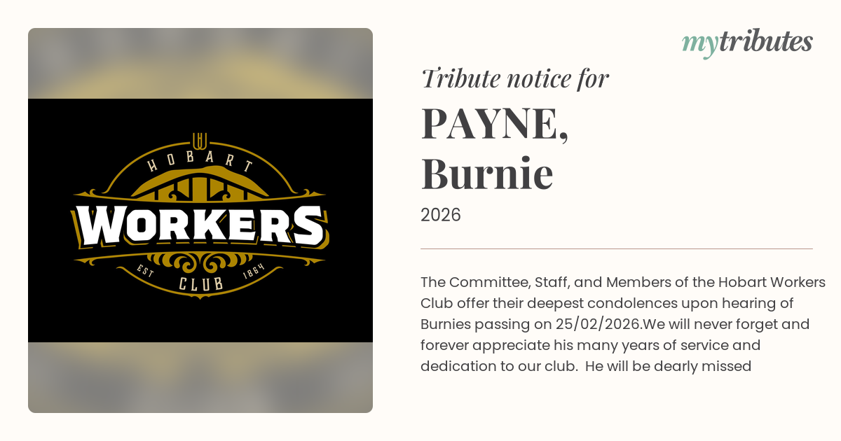 19°CThe Committee, Staff, and Members of the Hobart Workers Club offer their deepest condolences upon hearing of Burnie’s passing on 25/02/2026.