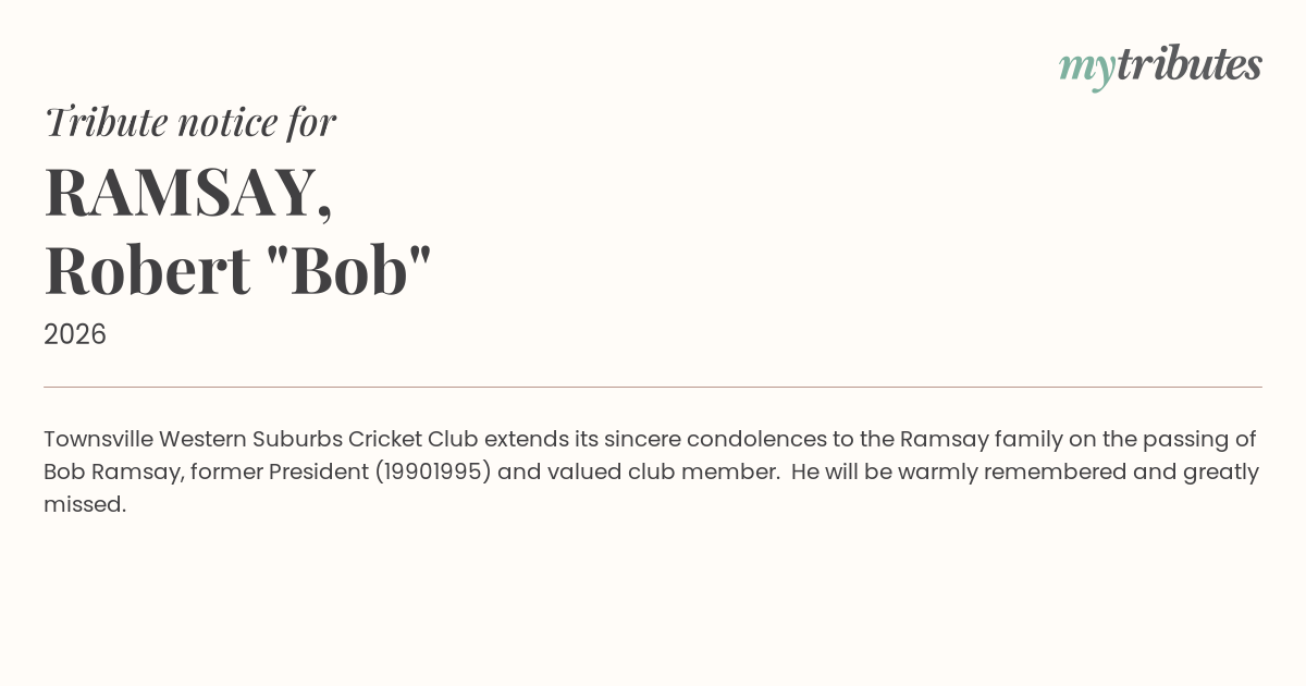 19°CTownsville Western Suburbs Cricket Club extends its sincere condolences to the Ramsay family on the passing of Bob Ramsay, former President (1990–1995) and valued club member. He will be warmly remembered and greatly missed.