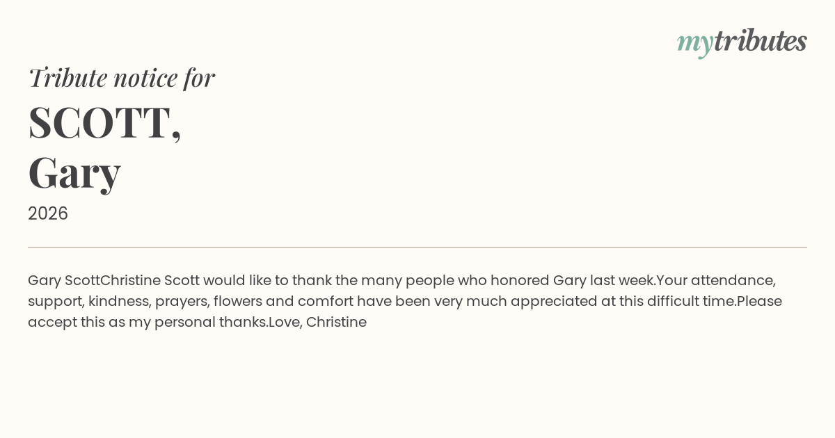 Your attendance, support, kindness, prayers, flowers and comfort have been very much appreciated at this difficult time.