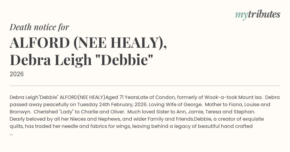 Late of Condon, formerly of Wook-a-took Mount Isa. Debra passed away peacefully on Tuesday 24th February, 2026. Loving Wife of George. Mother to Fiona, Louise and Bronwyn. Cherished "Lady" to Charlie and Oliver. Much loved Sister to Ann, Jamie, Teresa and Stephan. Dearly beloved by all her Nieces and Nephews, and wider Family and Friends.