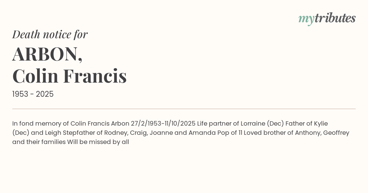 19°CIn fond memory of Colin Francis Arbon 27/2/1953-11/10/2025 Life partner of Lorraine (Dec) Father of Kylie (Dec) and Leigh Stepfather of Rodney, Craig, Joanne and Amanda Pop of 11 Loved brother of Anthony, Geoffrey and their families Will be missed by all