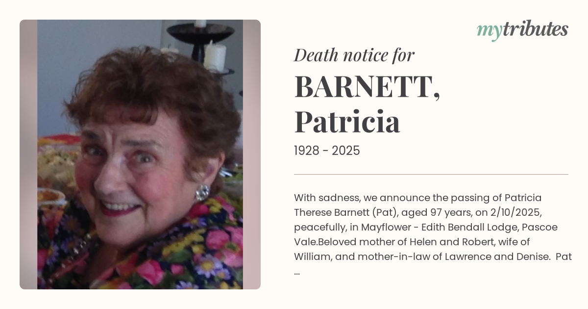 19°CWith sadness, we announce the passing of Patricia Therese Barnett (Pat), aged 97 years, on 2/10/2025, peacefully, in Mayflower - Edith Bendall Lodge, Pascoe Vale.