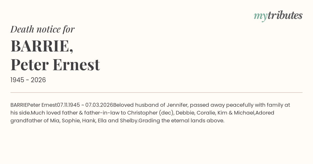 Much loved father & father-in-law to Christopher (dec), Debbie, Coralie, Kim & Michael,
