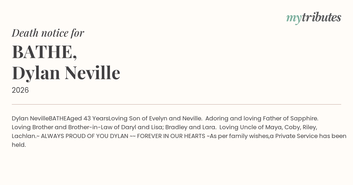 Loving Son of Evelyn and Neville. Adoring and loving Father of Sapphire. Loving Brother and Brother-in-Law of Daryl and Lisa; Bradley and Lara. Loving Uncle of Maya, Coby, Riley, Lachlan.