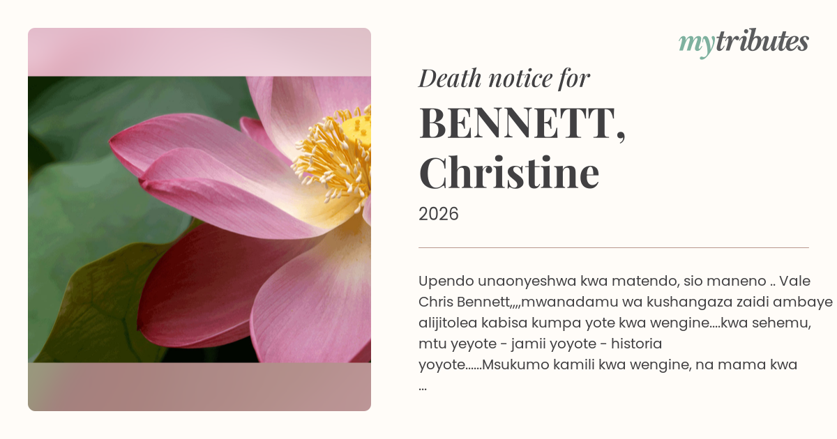 …….. Vale Chris Bennett,,,,mwanadamu wa kushangaza zaidi ambaye alijitolea kabisa kumpa yote kwa wengine....kwa sehemu, mtu yeyote - jamii yoyote - historia yoyote......