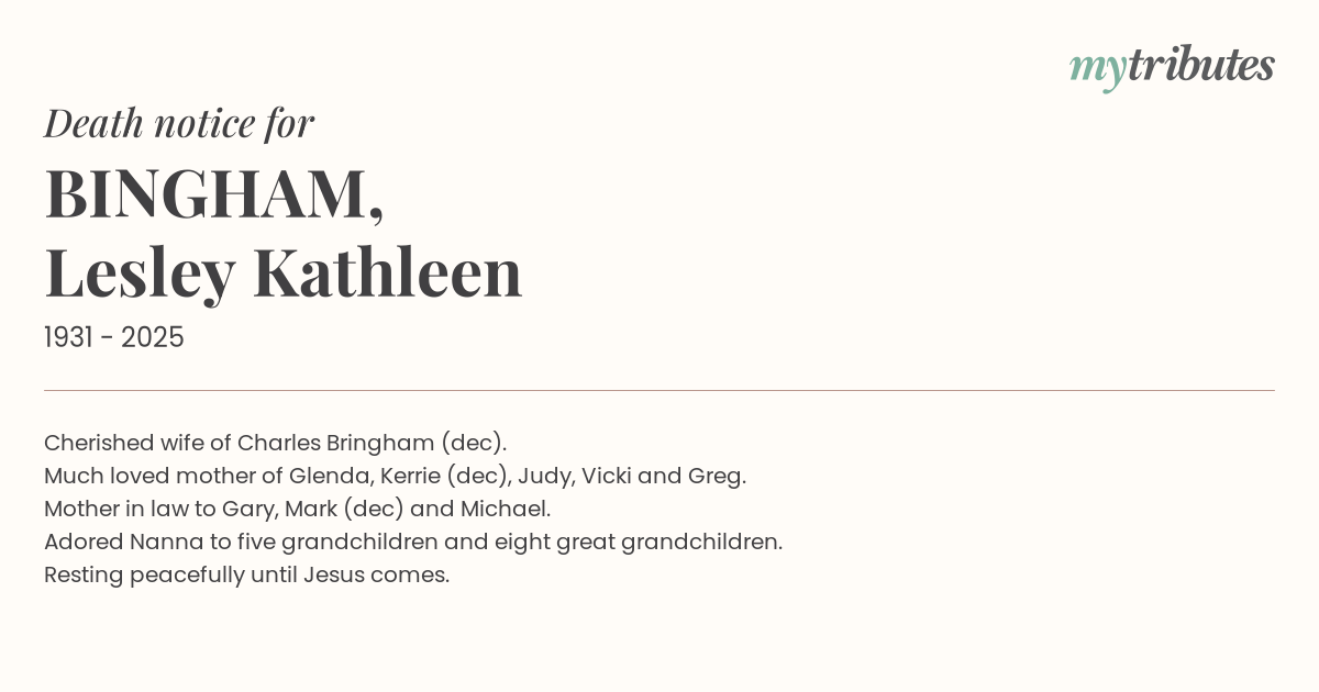 Adored Nanna to five grandchildren and eight great grandchildren.