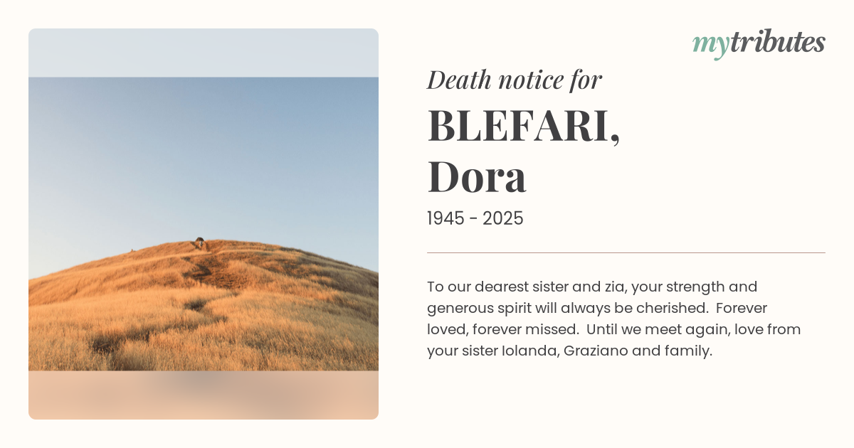 19°CTo our dearest sister and zia, your strength and generous spirit will always be cherished. Forever loved, forever missed. Until we meet again, love from your sister Iolanda, Graziano and family.