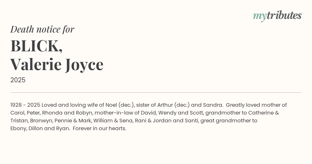 19°C1928 - 2025 Loved and loving wife of Noel (dec.), sister of Arthur (dec.) and Sandra. Greatly loved mother of Carol, Peter, Rhonda and Robyn, mother-in-law of David, Wendy and Scott, grandmother to Catherine & Tristan, Bronwyn, Pennie & Mark, William & Sena, Rani & Jordan and Santi, great grandmother to Ebony, Dillon and Ryan. Forever in our hearts.