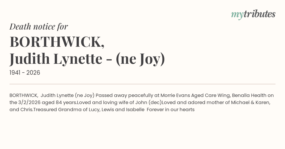 19°CBORTHWICK, Judith Lynette (neé Joy)