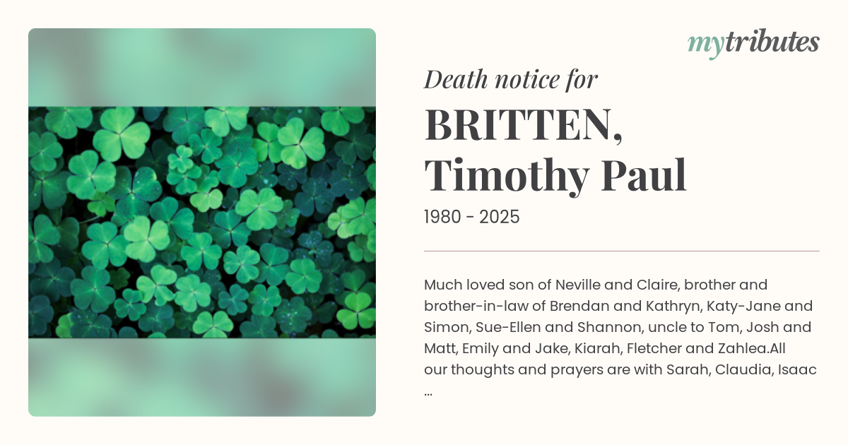 19°CMuch loved son of Neville and Claire, brother and brother-in-law of Brendan and Kathryn, Katy-Jane and Simon, Sue-Ellen and Shannon, uncle to Tom, Josh and Matt, Emily and Jake, Kiarah, Fletcher and Zahlea.