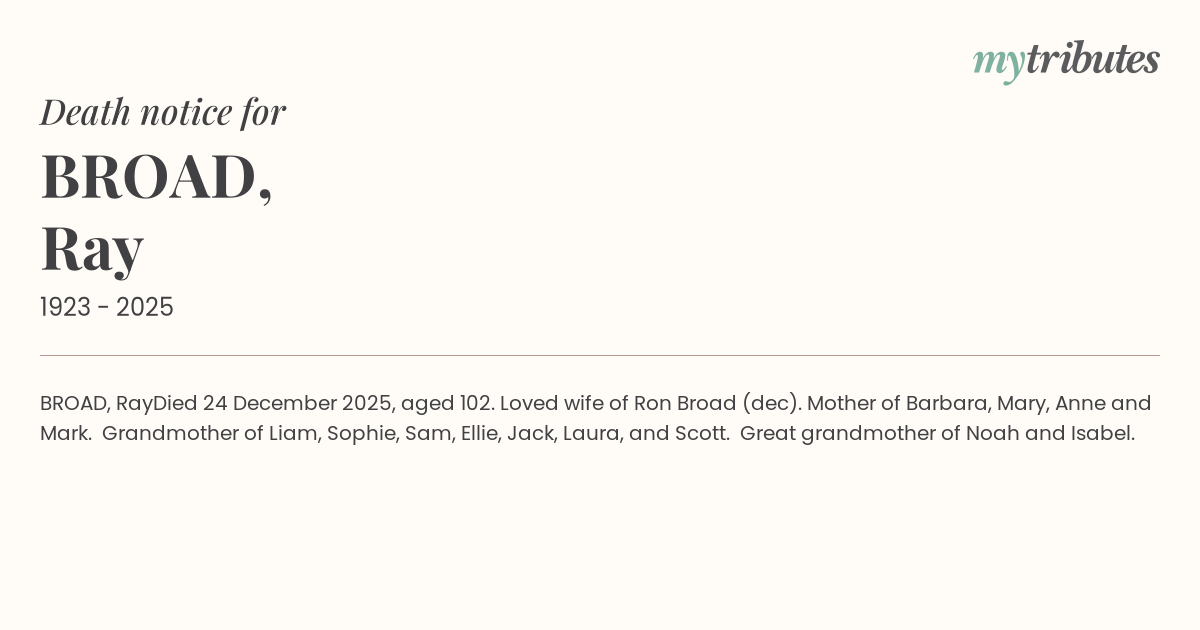 Mother of Barbara, Mary, Anne and Mark. Grandmother of Liam, Sophie, Sam, Ellie, Jack, Laura, and Scott.