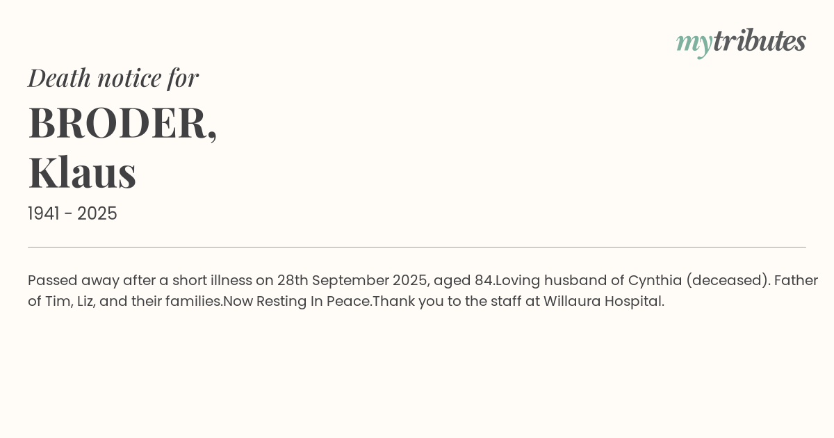 19°CPassed away after a short illness on 28th September 2025, aged 84.