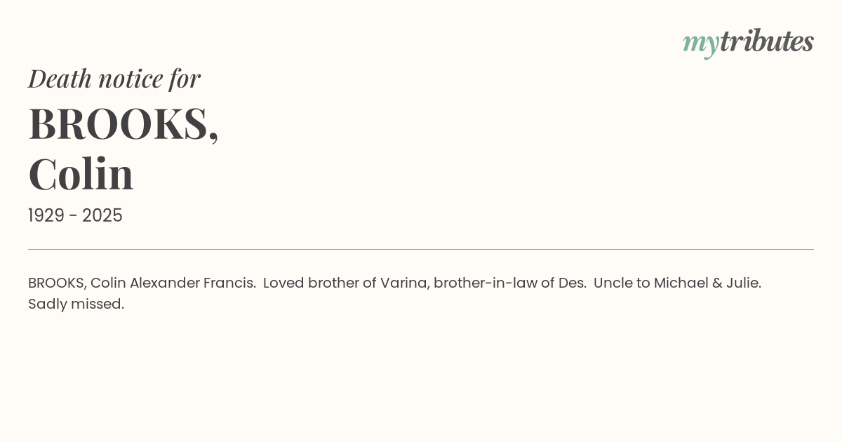 19°CBROOKS, Colin Alexander Francis. Loved brother of Varina, brother-in-law of Des. Uncle to Michael & Julie. Sadly missed.