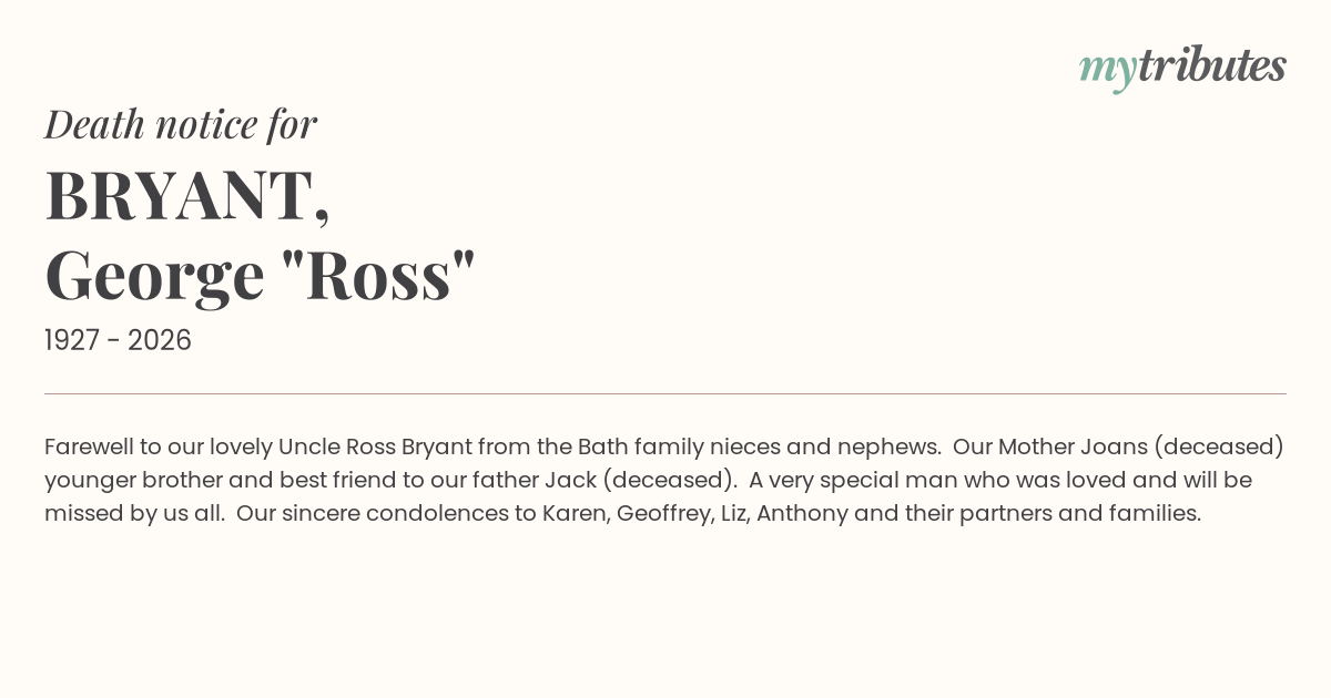 19°CFarewell to our lovely Uncle Ross Bryant from the Bath family nieces and nephews. Our Mother Joan’s (deceased) younger brother and best friend to our father Jack (deceased). A very special man who was loved and will be missed by us all. Our sincere condolences to Karen, Geoffrey, Liz, Anthony and their partners and families.