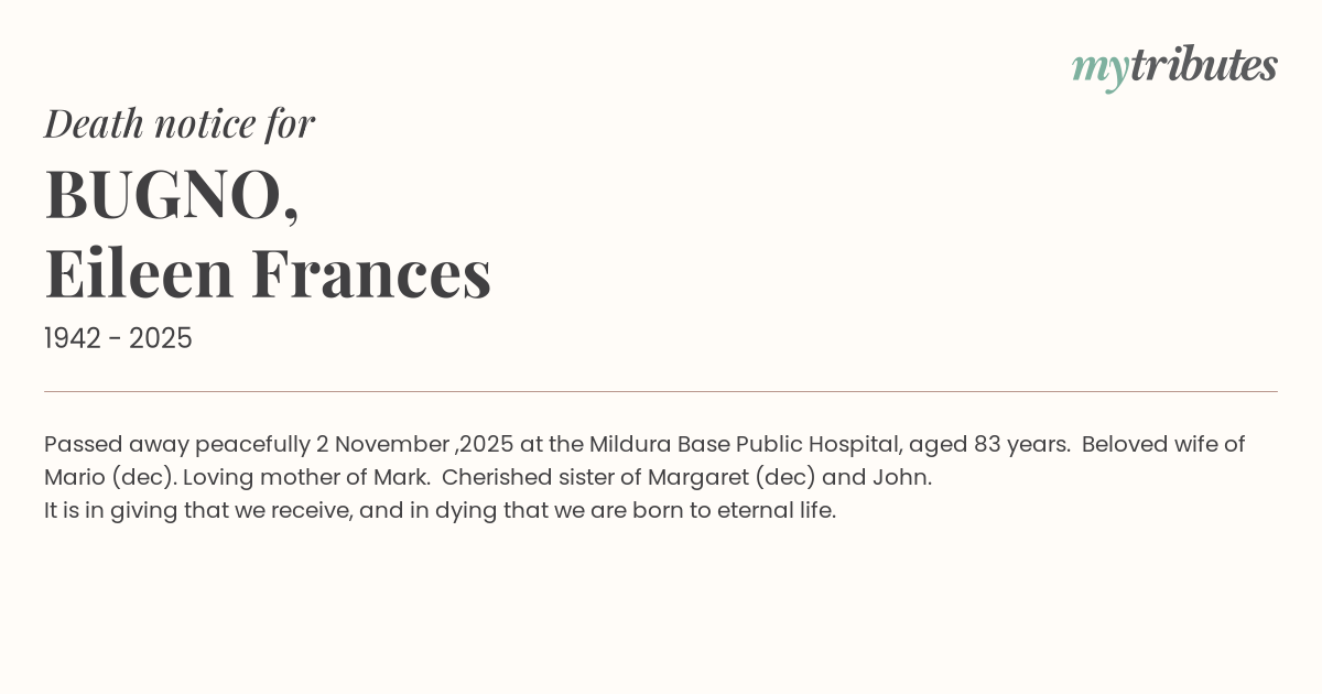 19°CPassed away peacefully 2 November ,2025 at the Mildura Base Public Hospital, aged 83 years. Beloved wife of Mario (dec). Loving mother of Mark. Cherished sister of Margaret (dec) and John.