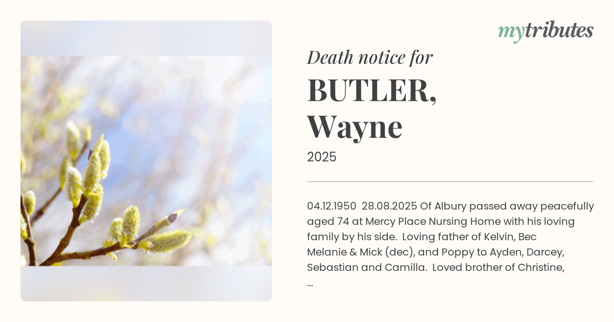 Of Albury passed away peacefully aged 74 at Mercy Place Nursing Home with his loving family by his side. Loving father of Kelvin, Bec Melanie & Mick (dec), and Poppy to Ayden, Darcey, Sebastian and Camilla. Loved brother of Christine, Joe, Brian and families, Dawn (dec) Sandra (dec). Returning home to parents Rose & Brian (both dec). Thank you to the staff of Mercy Place.