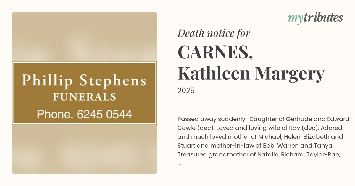 19°CPassed away suddenly. Daughter of Gertrude and Edward Cowle (dec). Loved and loving wife of Ray (dec). Adored and much loved mother of Michael, Helen, Elizabeth and Stuart and mother-in-law of Bob, Warren and Tanya. Treasured grandmother of Natalie, Richard, Taylor-Rae, Reece, Mikayla, Elliot and Finn and great-grandmother of Brooke, Jack, Joel, Lucas and Kasey. Beautiful lady, reunited with Dad.