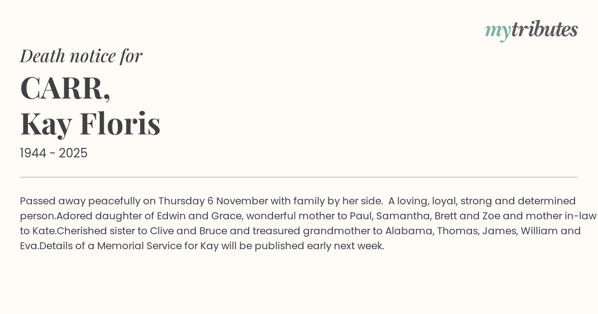 19°CPassed away peacefully on Thursday 6 November with family by her side. A loving, loyal, strong and determined person.