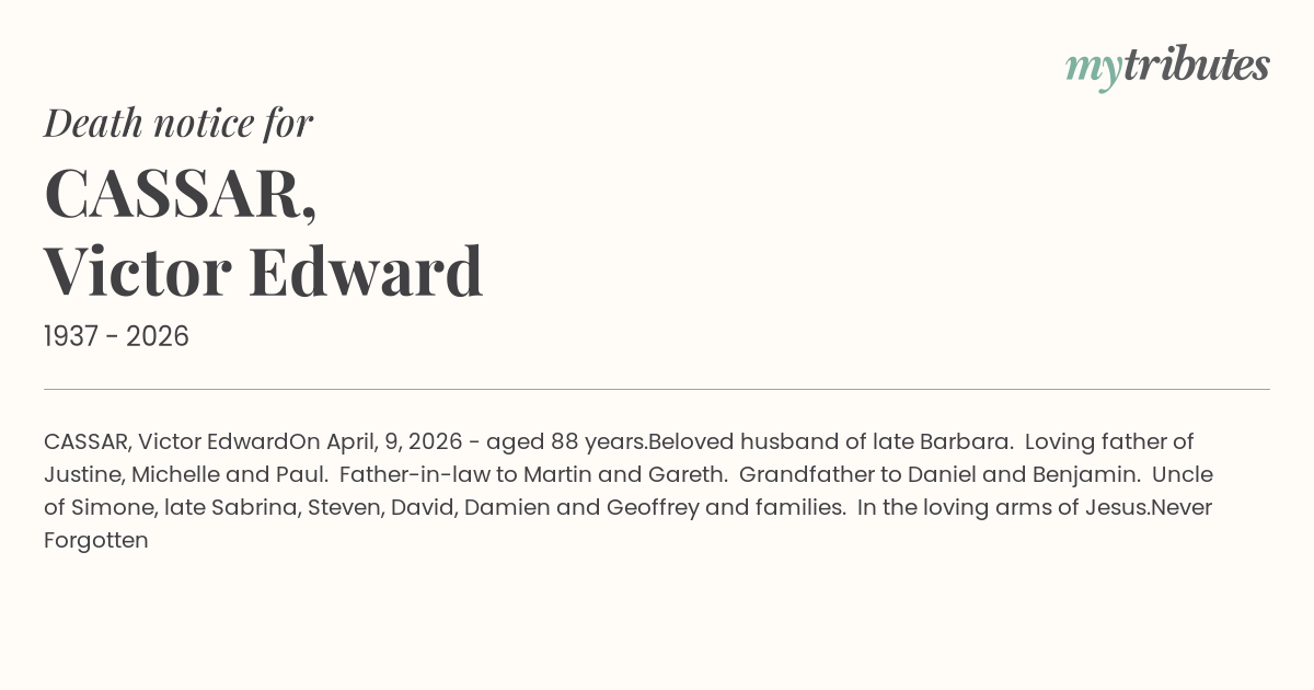 Beloved husband of late Barbara. Loving father of Justine, Michelle and Paul. Father-in-law to Martin and Gareth. Grandfather to Daniel and Benjamin.