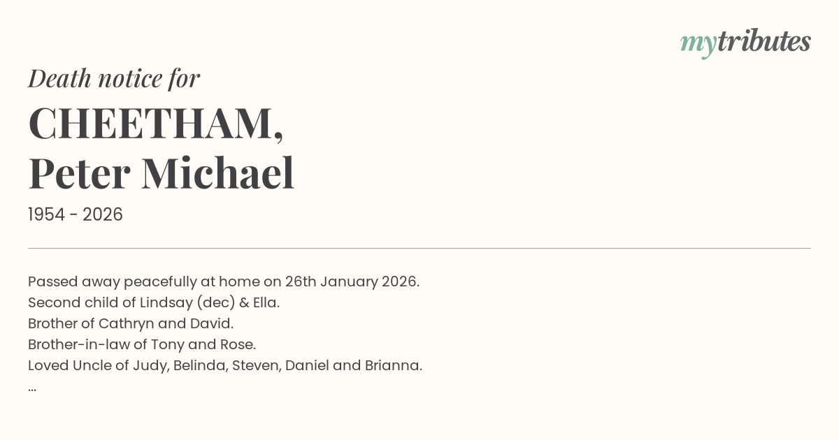 Loved Uncle of Judy, Belinda, Steven, Daniel and Brianna.