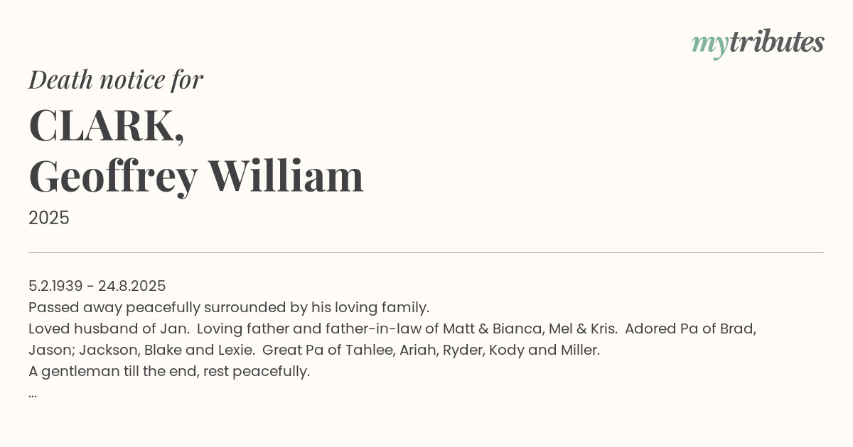 Loved husband of Jan. Loving father and father-in-law of Matt & Bianca, Mel & Kris. Adored Pa of Brad, Jason; Jackson, Blake and Lexie. Great Pa of Tahlee, Ariah, Ryder, Kody and Miller.
