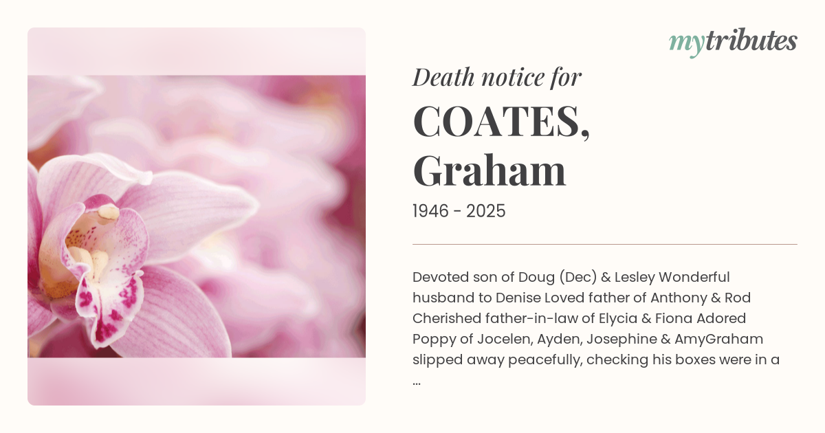 19°CDevoted son of Doug (Dec) & Lesley Wonderful husband to Denise Loved father of Anthony & Rod Cherished father-in-law of Elycia & Fiona Adored Poppy of Jocelen, Ayden, Josephine & Amy