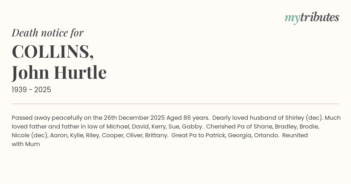 19°CPassed away peacefully on the 26th December 2025 Aged 86 years. Dearly loved husband of Shirley (dec). Much loved father and father in law of Michael, David, Kerry, Sue, Gabby. Cherished Pa of Shane, Bradley, Brodie, Nicole (dec), Aaron, Kylie, Riley, Cooper, Oliver, Brittany. Great Pa to Patrick, Georgia, Orlando. Reunited with Mum
