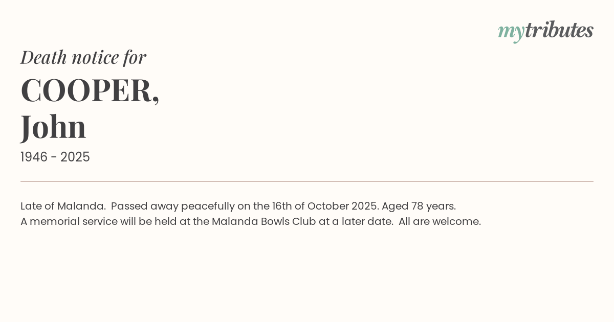 19°CLate of Malanda. Passed away peacefully on the 16th of October 2025. Aged 78 years.