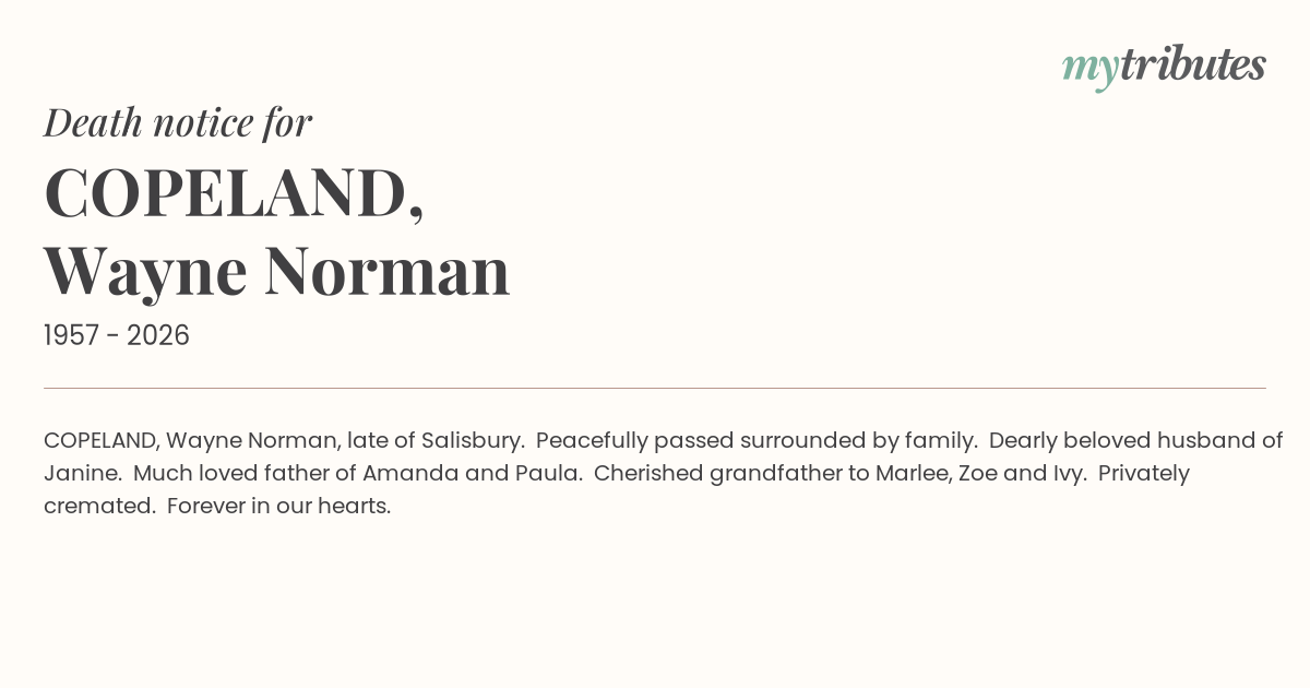 19°CCOPELAND, Wayne Norman, late of Salisbury.