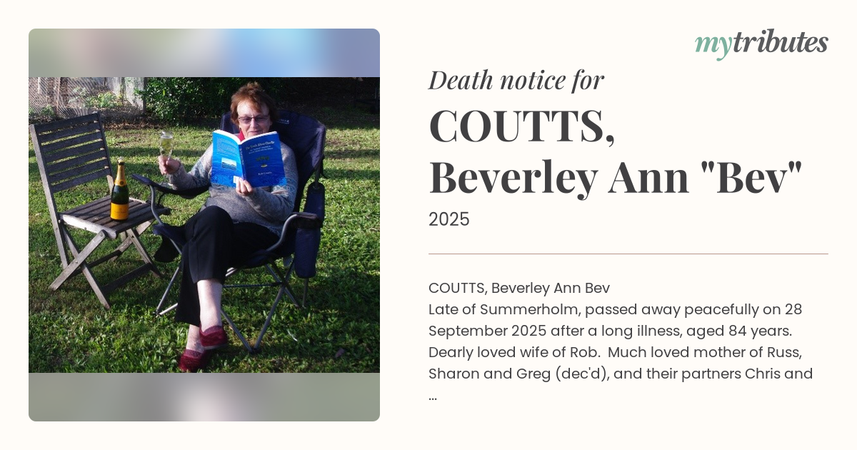 Late of Summerholm, passed away peacefully on 28 September 2025 after a long illness, aged 84 years.