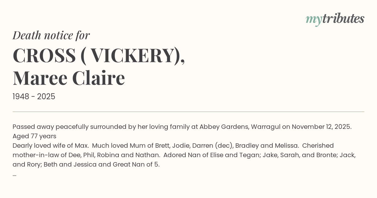 19°CPassed away peacefully surrounded by her loving family at Abbey Gardens, Warragul on November 12, 2025.