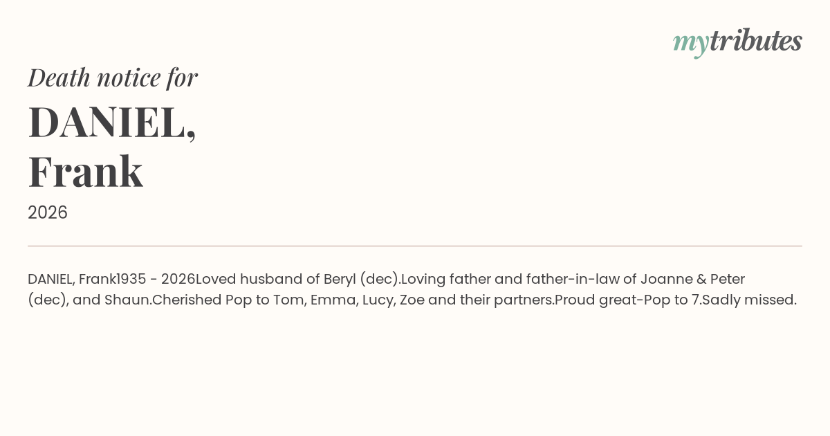 Loving father and father-in-law of Joanne & Peter (dec), and Shaun.