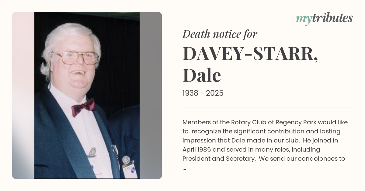 19°CMembers of the Rotary Club of Regency Park would like to recognize the significant contribution and lasting impression that Dale made in our club. He joined in April 1986 and served in many roles, including President and Secretary. We send our condolonces to his wife Helen and children and grandchildren. We will all miss him greatly as a fellow Rotarian and good friend.