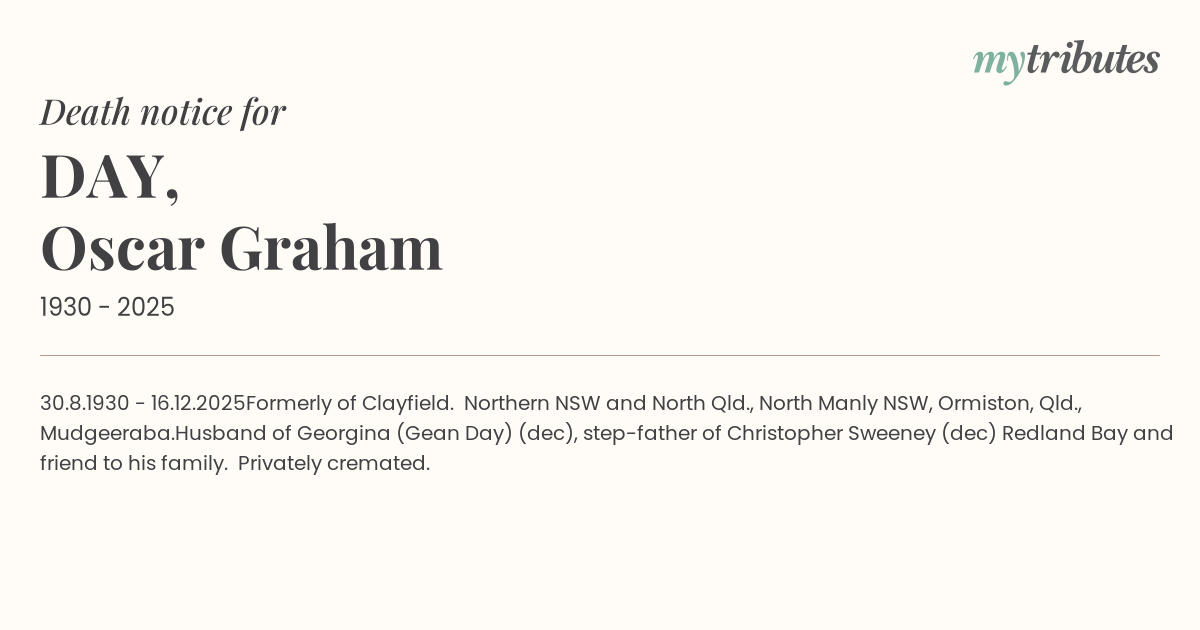 Husband of Georgina (Gean Day) (dec), step-father of Christopher Sweeney (dec) Redland Bay and friend to his family.