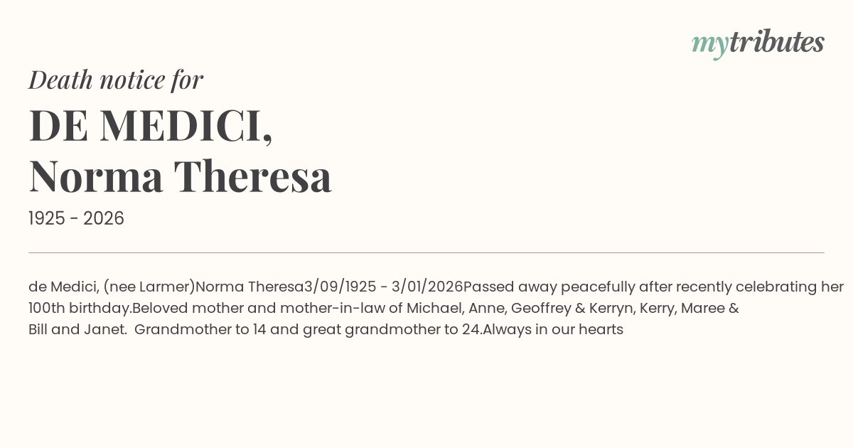 Beloved mother and mother-in-law of Michael, Anne, Geoffrey & Kerryn, Kerry, Maree & Bill and Janet. Grandmother to 14 and great grandmother to 24.