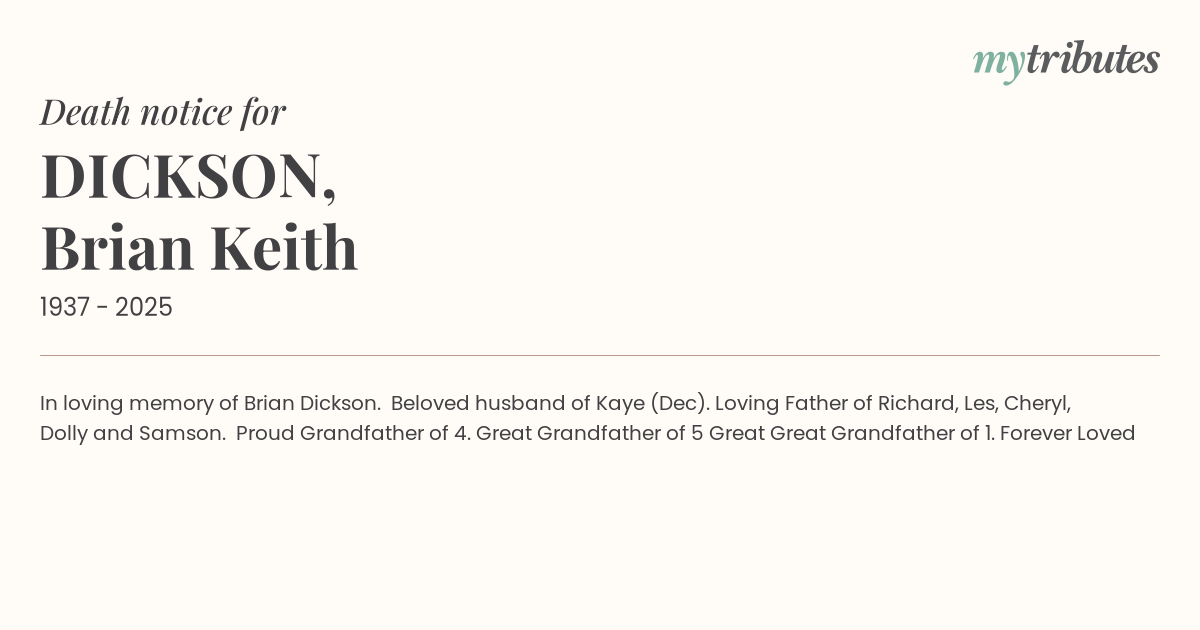 19°CIn loving memory of Brian Dickson. Beloved husband of Kaye (Dec).