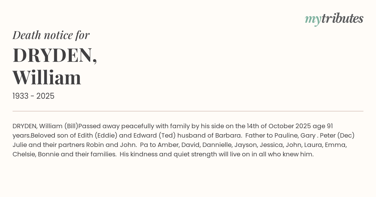 Passed away peacefully with family by his side on the 14th of October 2025 age 91 years.