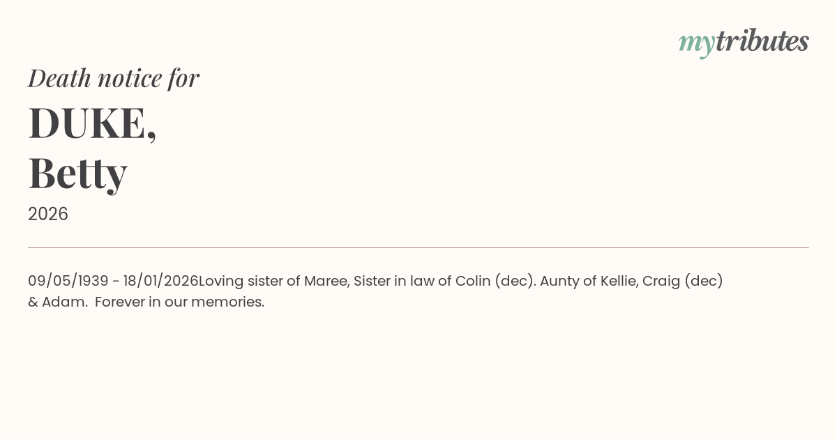 Loving sister of Maree, Sister in law of Colin (dec). Aunty of Kellie, Craig (dec) & Adam. Forever in our memories.