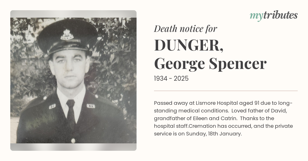19°CPassed away at Lismore Hospital aged 91 due to long-standing medical conditions. Loved father of David, grandfather of Eileen and Catrin. Thanks to the hospital staff.