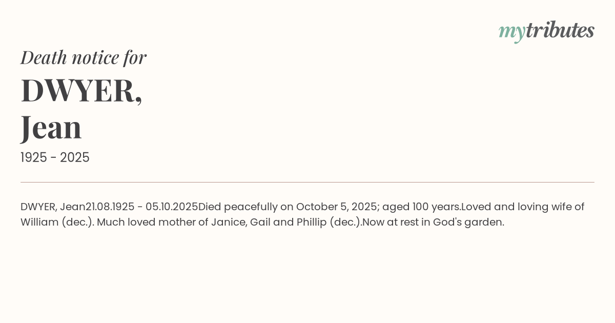 Died peacefully on October 5, 2025; aged 100 years.
