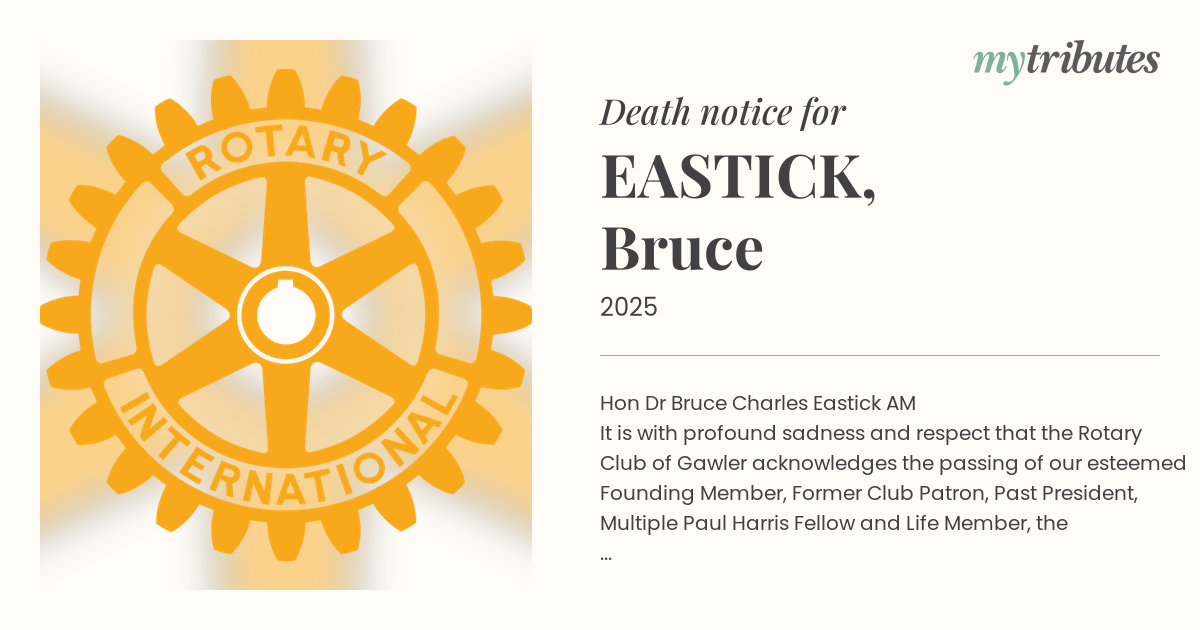 It is with profound sadness and respect that the Rotary Club of Gawler acknowledges the passing of our esteemed Founding Member, Former Club Patron, Past President, Multiple Paul Harris Fellow and Life Member, the Honourable Dr. Bruce Eastick, AM.