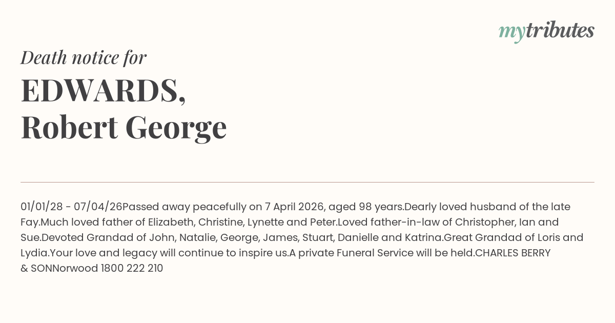 Much loved father of Elizabeth, Christine, Lynette and Peter.
