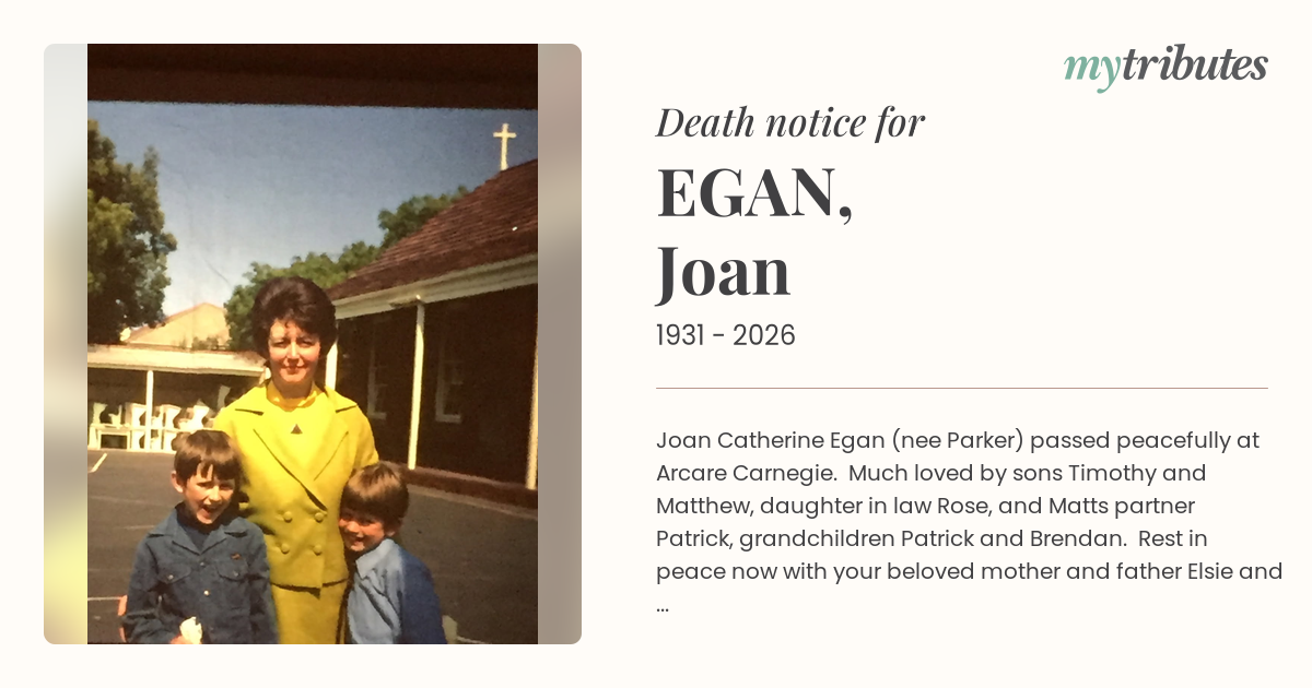 19°CJoan Catherine Egan (nee Parker) passed peacefully at Arcare Carnegie. Much loved by sons Timothy and Matthew, daughter in law Rose, and Matt’s partner Patrick, grandchildren Patrick and Brendan. Rest in peace now with your beloved mother and father Elsie and Philip and husband Les.